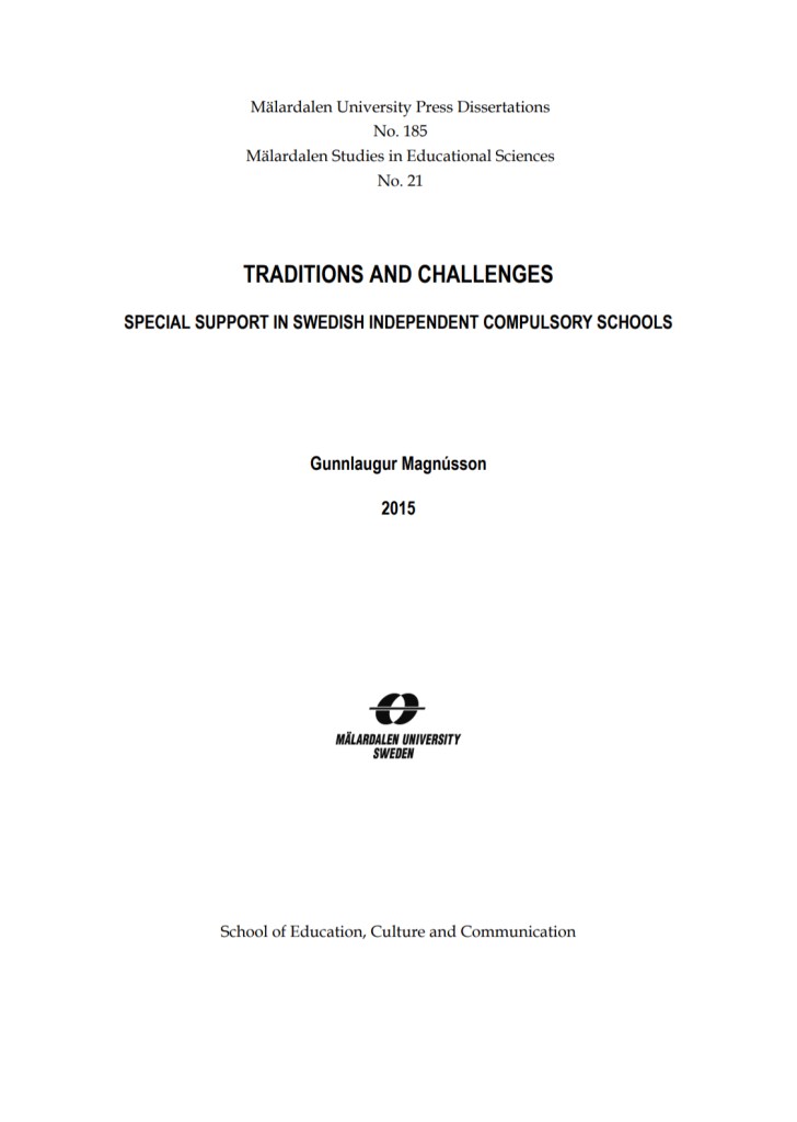 Magnússon, G. (2015). Traditions and Challenges: Special Support in Swedish Independent Compulsory Schools. Västerås: Mälardalen University. Open access PDF link here