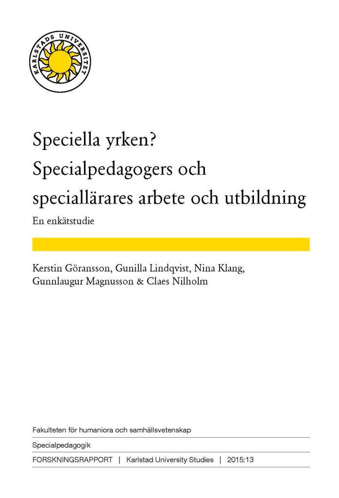 Göransson, K., Lindqvist, G., Klang, N., Magnússon, G., & Nilholm, C. (2015). Speciella yrken? : Specialpedagogers och speciallärares arbete och utbildning. Karlstad universitet: Karlstad.